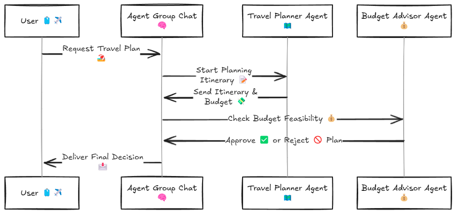 The following diagram showcases the workflow of an AI Concierge Service coordinated by an Agent Group Chat. The process begins with the User submitting a request for a travel plan. The Agent Group Chat directs the task to the Travel Planner Agent, which creates an itinerary and calculates the budget. This itinerary and budget are then sent to the Budget Advisor Agent, which checks the feasibility of the proposed plan within the specified budget.